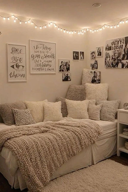 Les guirlandes lumineuses ont une touche magique. Elles peuvent faire de même dans votre chambre. Elles sont parfaites accrochées aux murs. Vous pouvez aussi les draper au-dessus de votre lit ou simplement créer une ambiance tamisée.