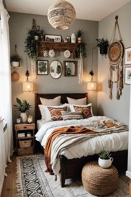 Pour une ambiance bohème, superposez du linge de lit blanc avec des éléments texturés et naturels. Commencez par des draps blancs doux et ajoutez un plaid en tricot ou une couverture à pompons dans des tons chauds et naturels comme le terracotta, le moutarde ou le vert olive. Associez des coussins aux motifs vibrants, des motifs en macramé ou des broderies pour une ambiance éclectique. Ajoutez des touches finales comme un tapis en jute et des plantes en pot pour parfaire l'esthétique bohème.