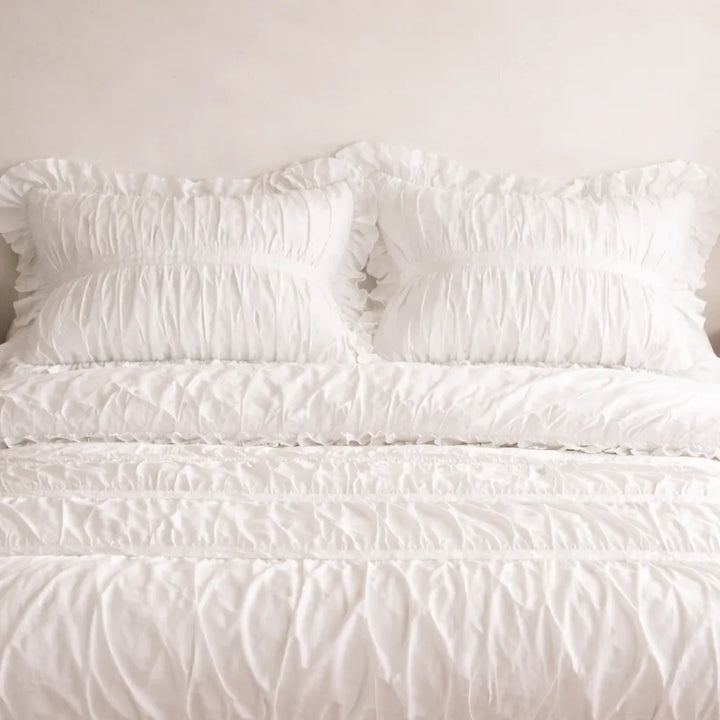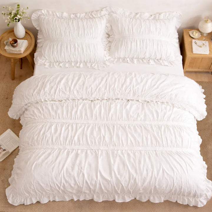 Transform your bedroom into a dreamy retreat with this ruched duvet cover adorned with soft, romantic ruffles. Designed to capture that effortlessly elegant “princess” aesthetic, it brings a sense of whimsy and charm to any space. The gathered texture adds volume and dimension, creating a cozy, cloud-like look that feels just as luxurious as it appears.